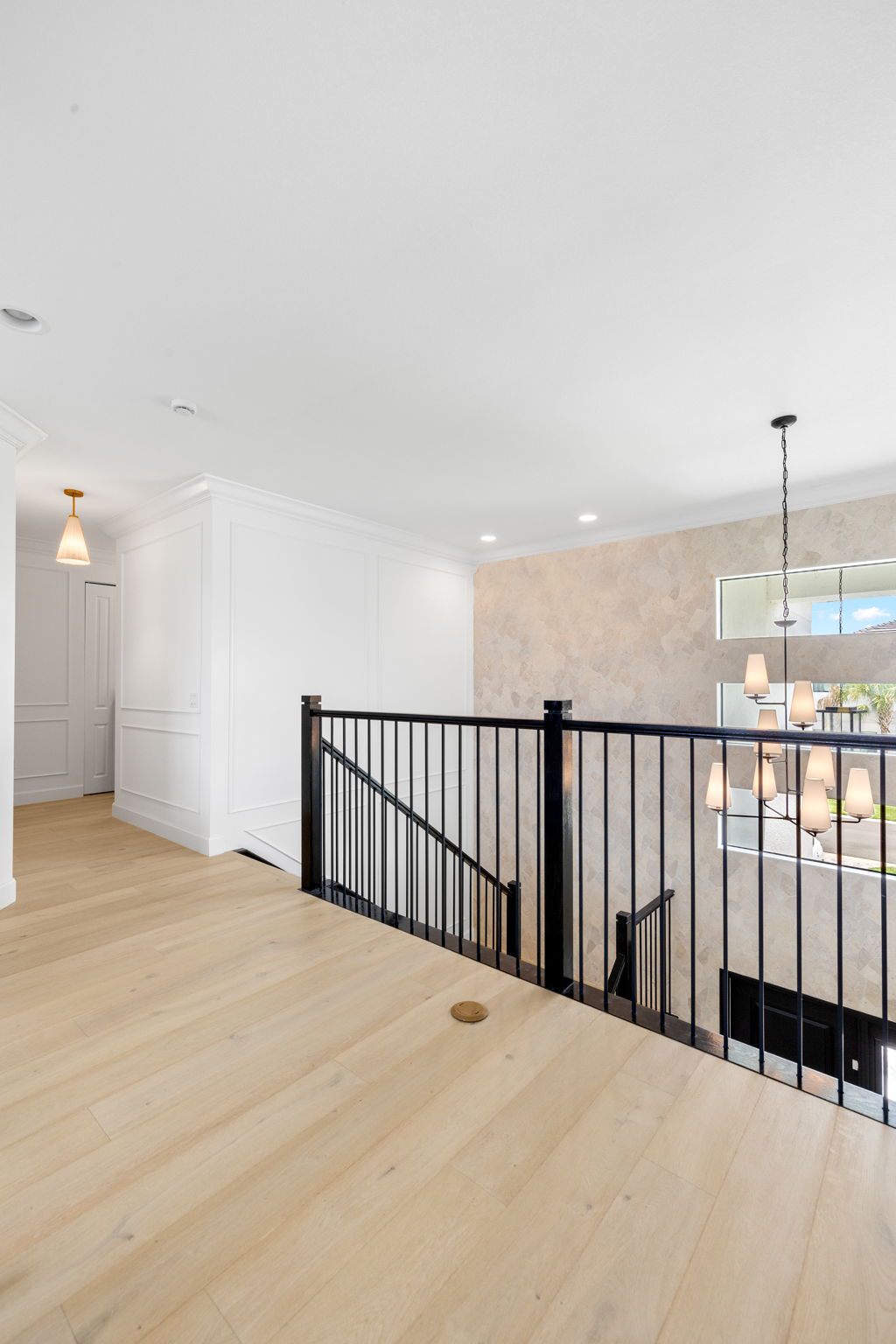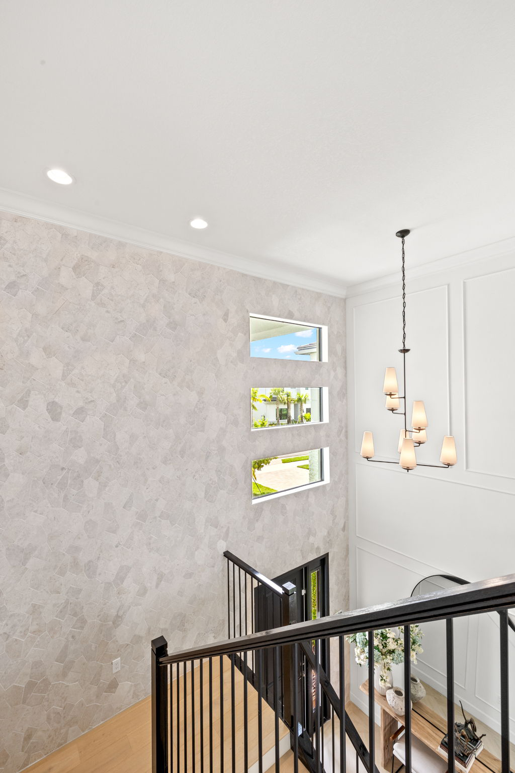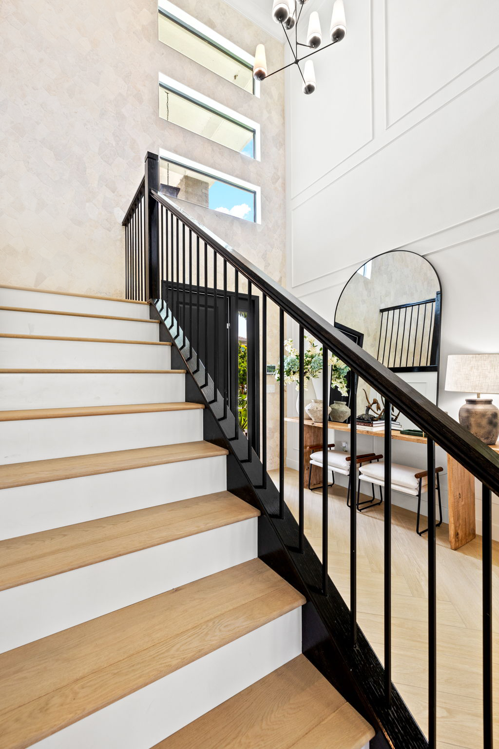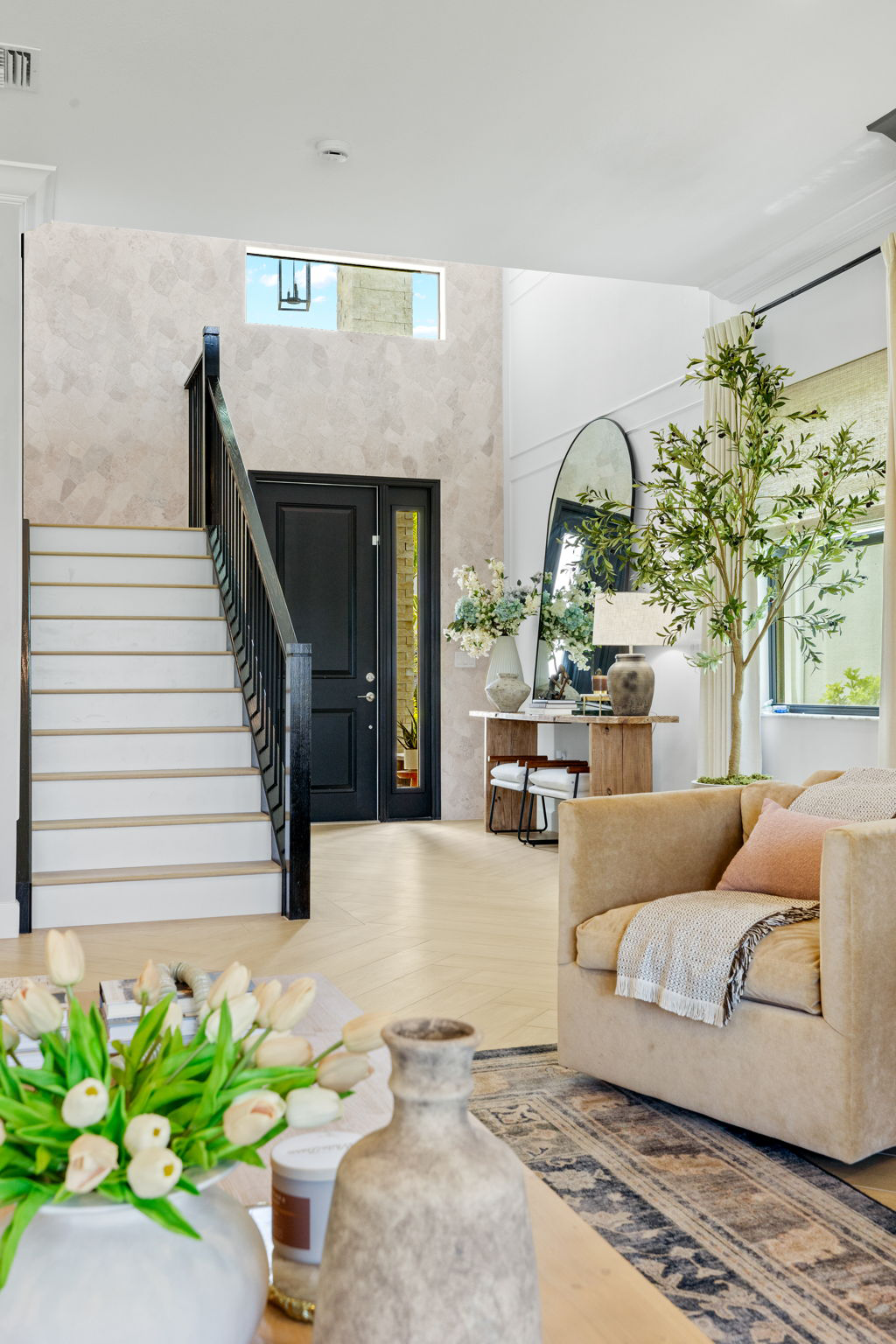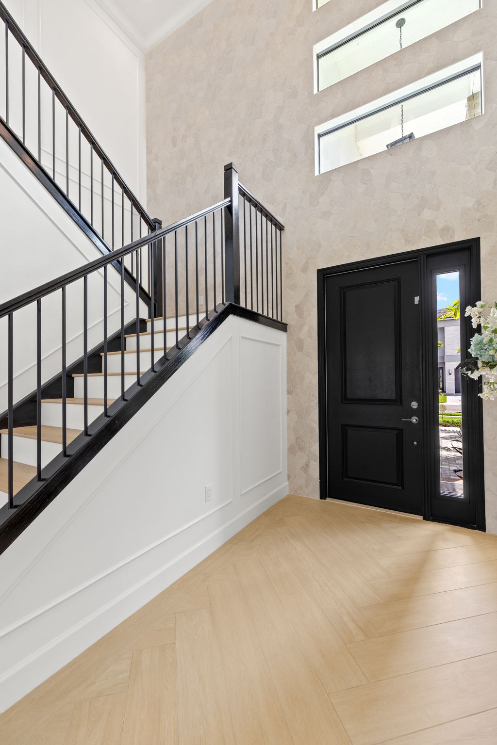 This entryway celebrates balance and contrast through texture and tone. A soft stone accent wall anchors the space, complementing the clean white paneling and warm wood floors. The black stair railing and door frame add structure and sophistication, creating a cohesive design that feels both modern and timeless.