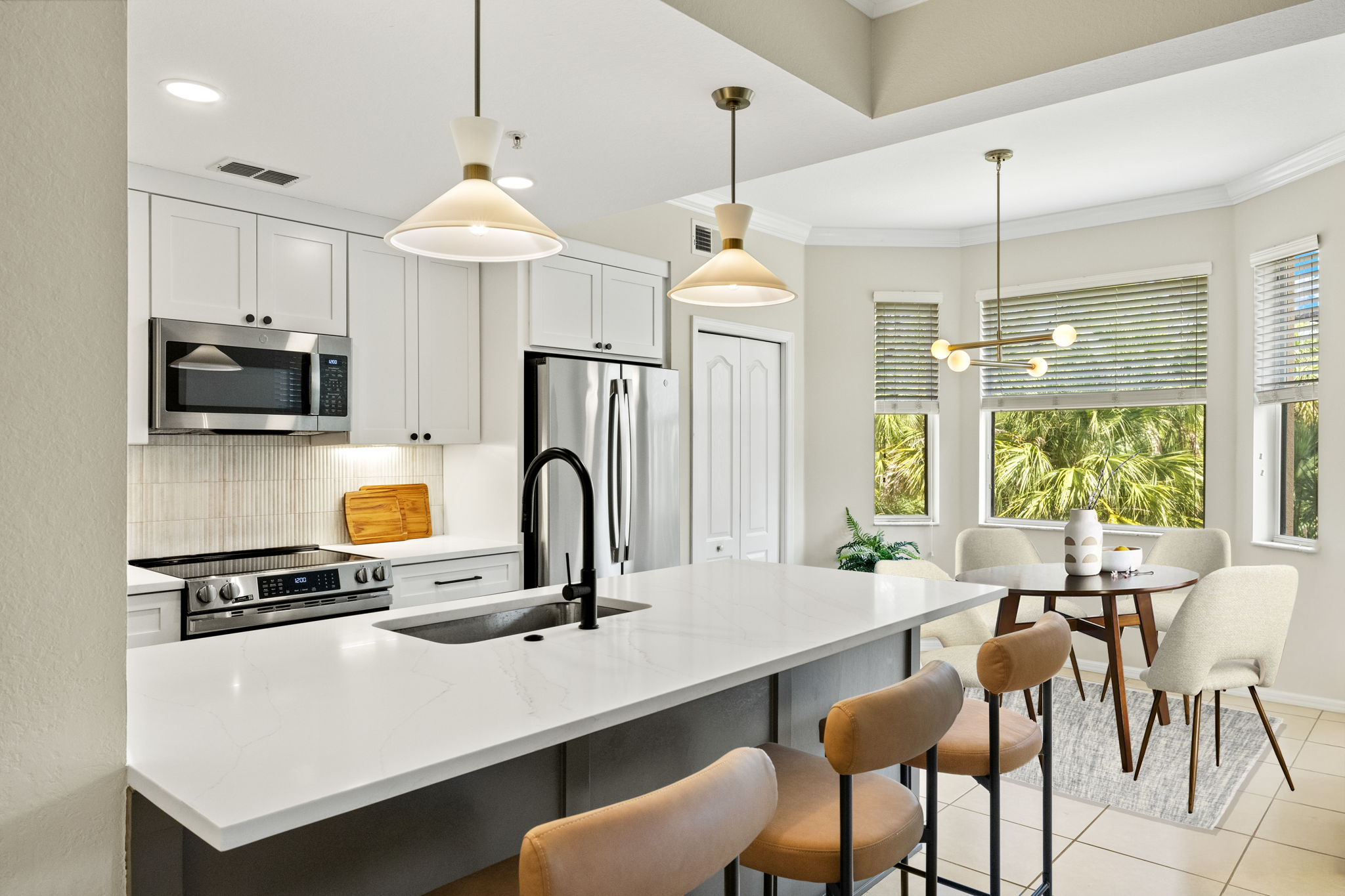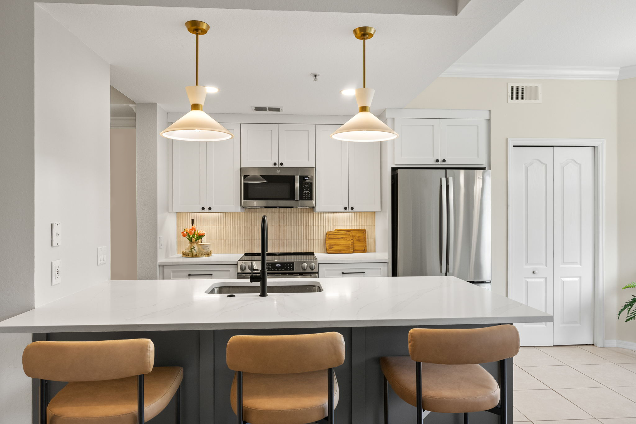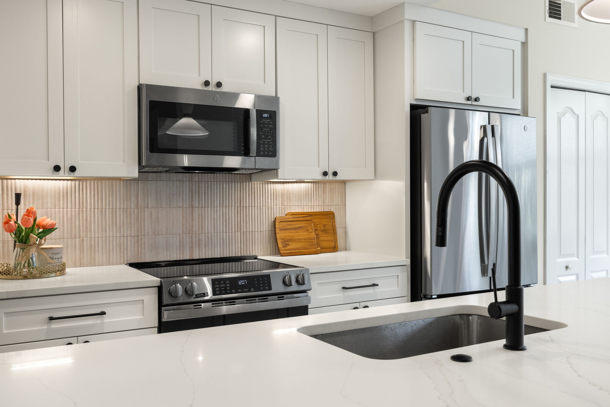 This kitchen remodel combines elegance with functionality in every detail. Bright cabinetry, modern lighting, and warm accents create an inviting atmosphere, while the redesigned layout maximizes space and flow. The result is a kitchen that feels open, organized, and effortlessly stylish.