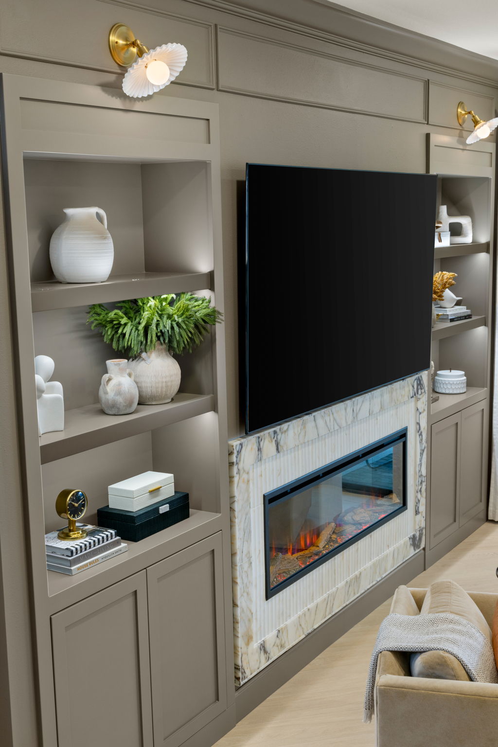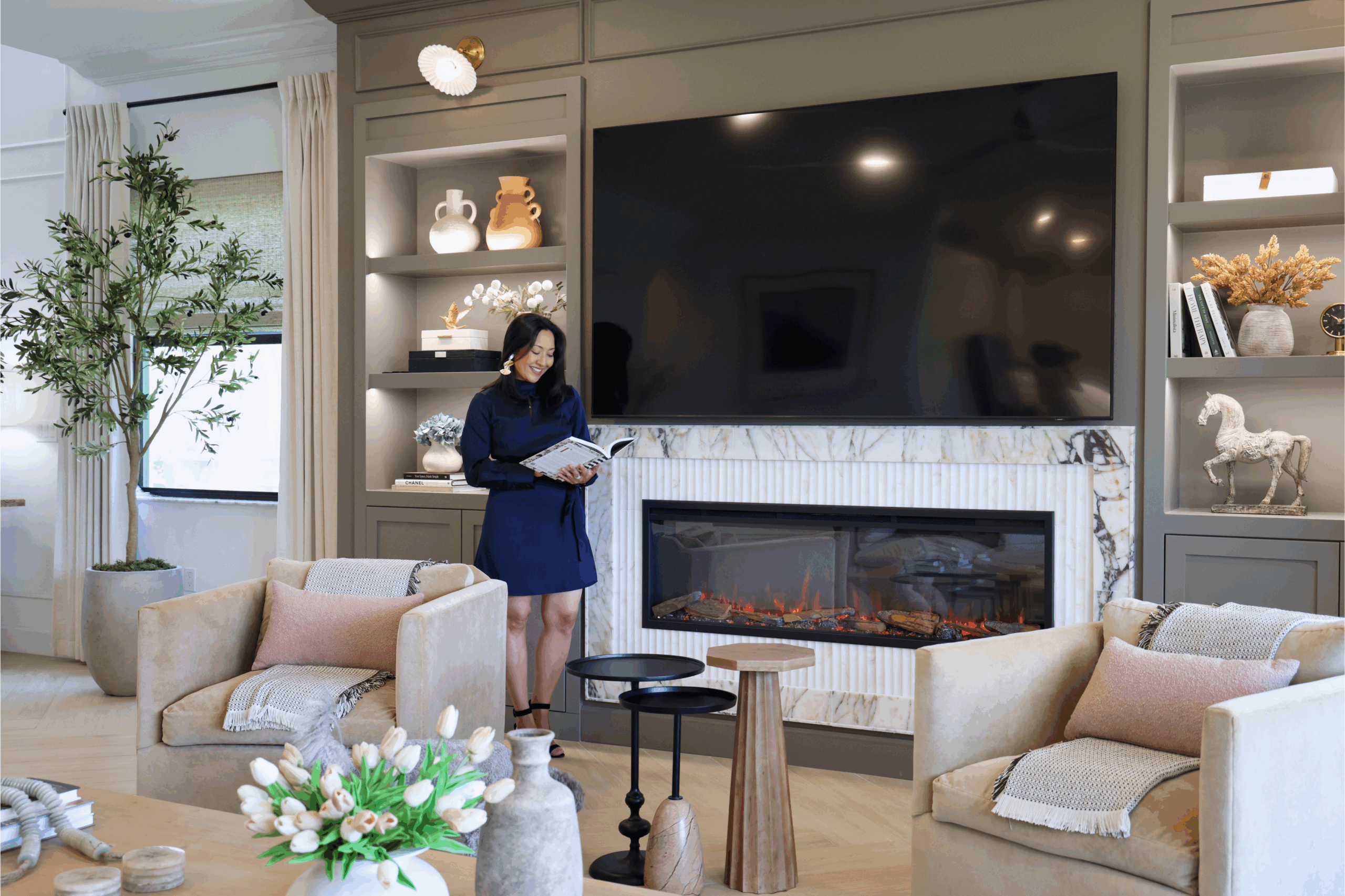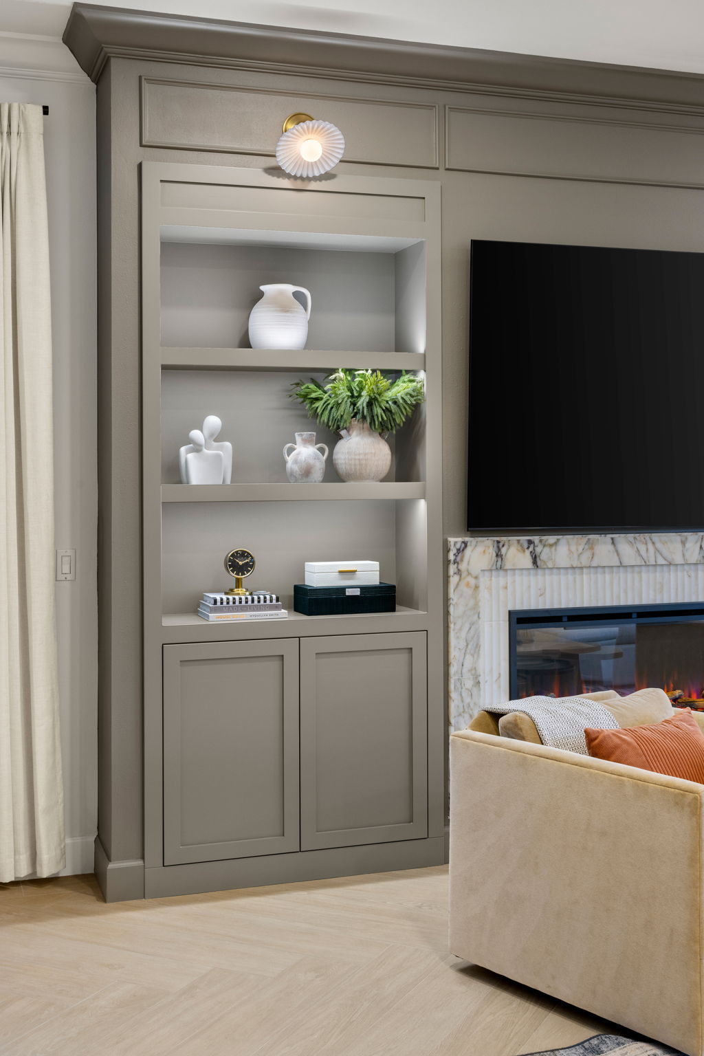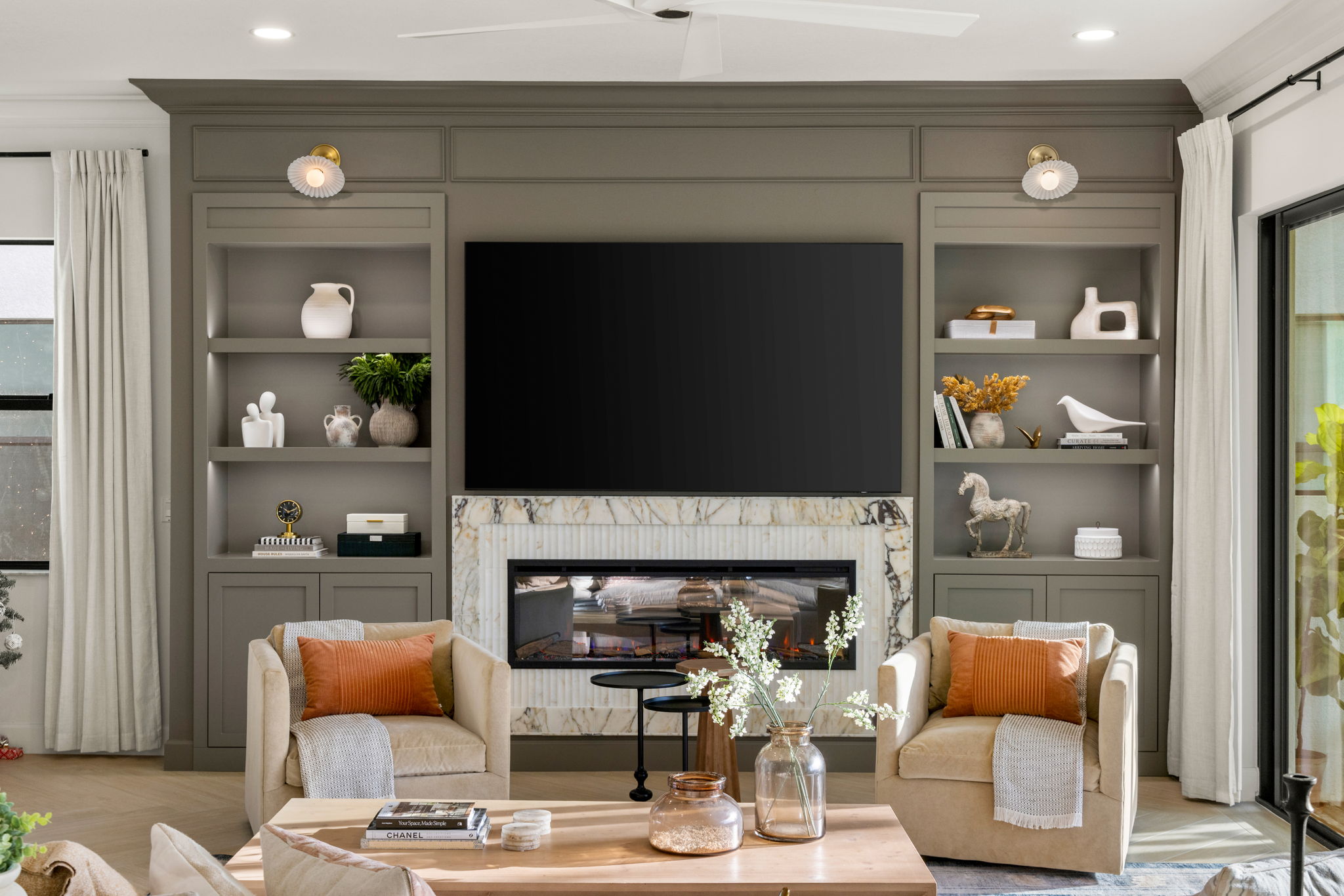 This living area was designed to bring comfort and sophistication into perfect balance. Custom built-ins, a marble-accented fireplace, and a muted palette create a timeless backdrop for family gatherings. Thoughtful styling and warm textures make the space inviting, layered, and beautifully cohesive.