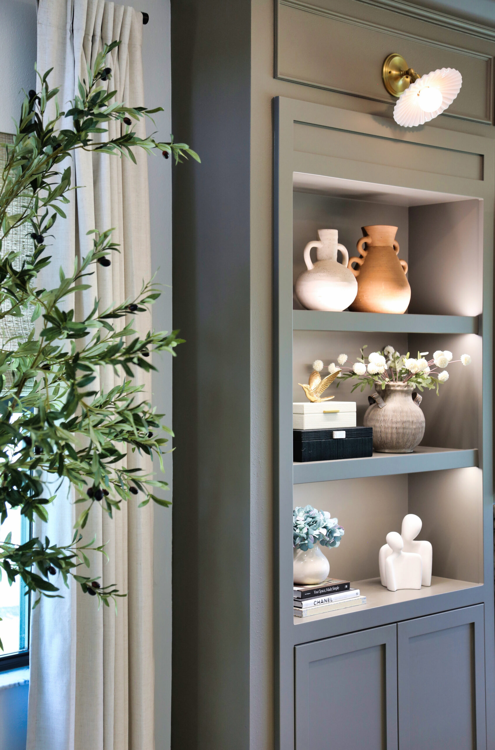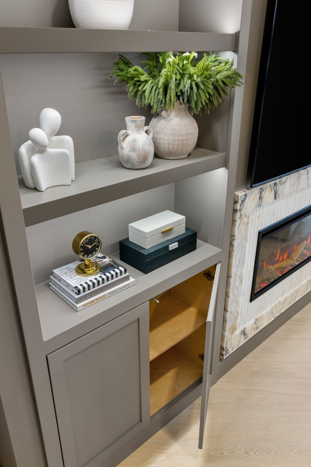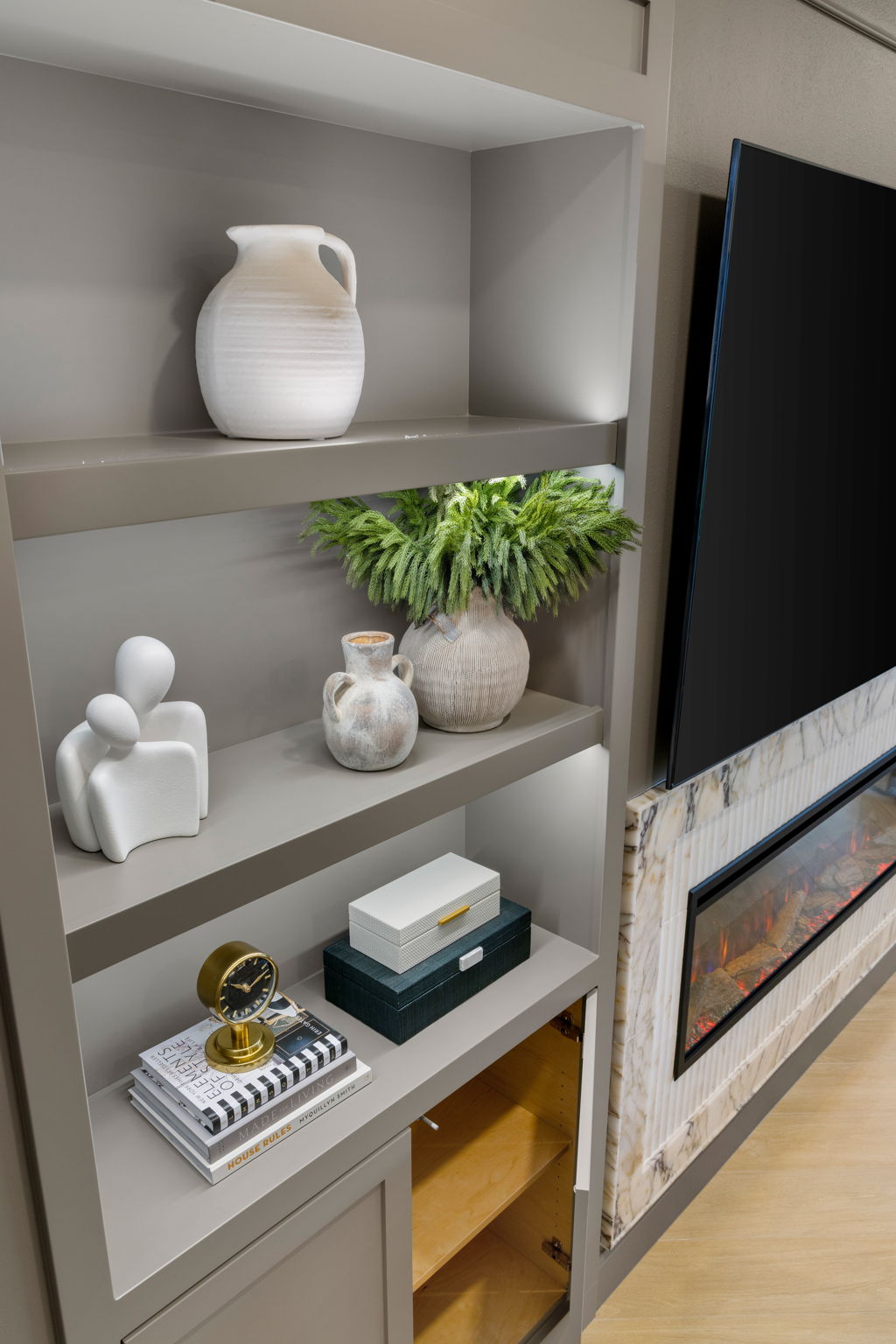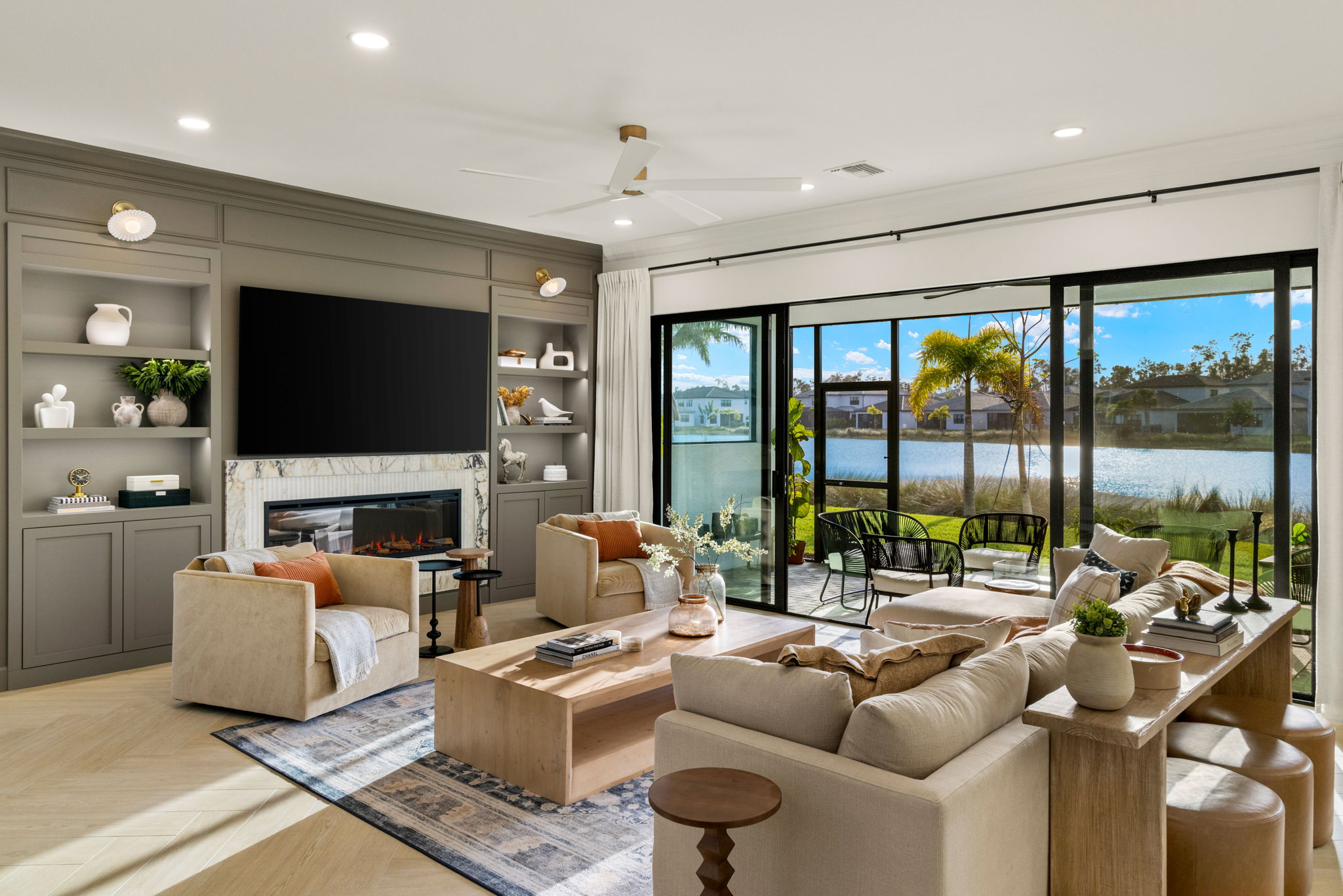 This living area was designed to bring comfort and sophistication into perfect balance. Custom built-ins, a marble-accented fireplace, and a muted palette create a timeless backdrop for family gatherings. Thoughtful styling and warm textures make the space inviting, layered, and beautifully cohesive.